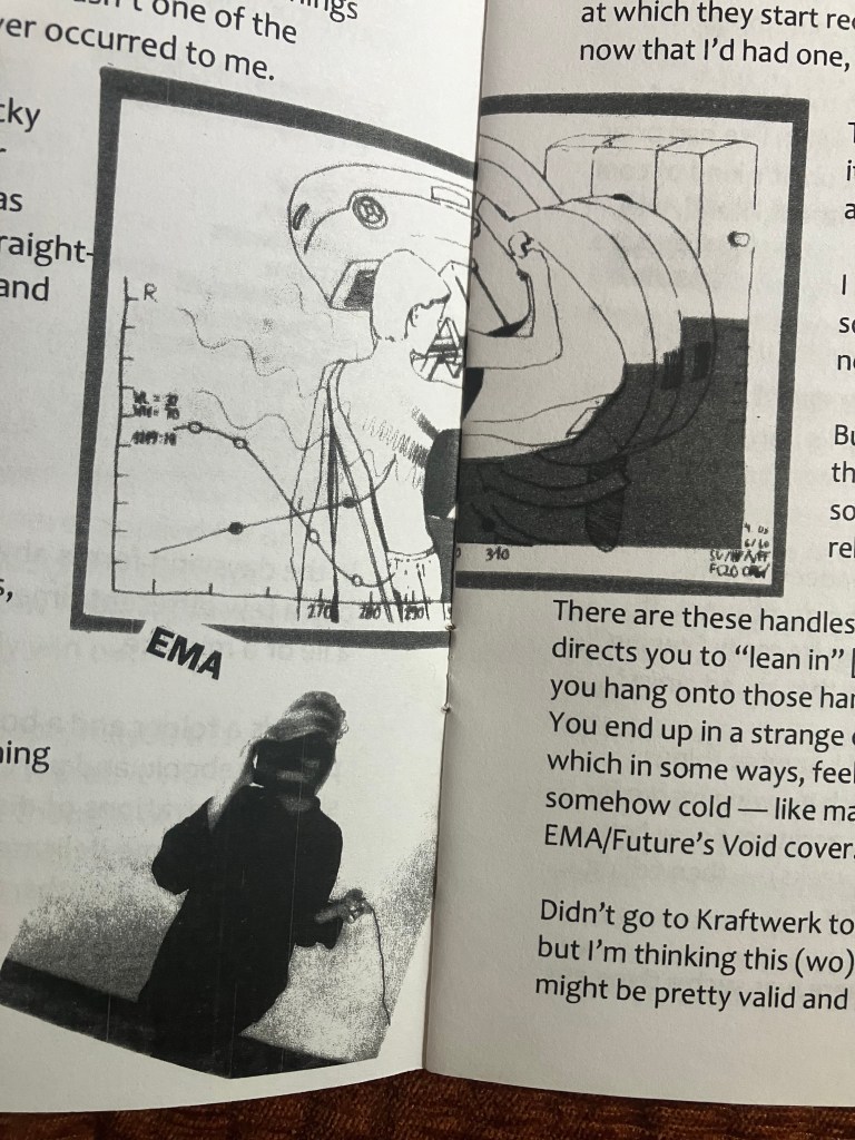 I stare into the weird video-game goggles and think about that EMA/The Future’s Void cover in the zine I made during my first go-round with this stuff seven years ago. I think about how I should’ve laid out that spread better, the adjacent diagram getting split more and more with each successive copy-and-staple. I think about the space between the pages and the slight pull of a scar, the attempt to join things together. I think about replication, how in libraries and archives sometimes we talk about replication supporting preservation, that the more copies there are of something, the more likely it is a copy will remain. I think about bout how that’s good for zines and ephemera, and bad in terms of cancer cells.