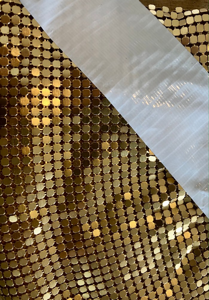 In the giant mirror-eye above me, with its opening and closing aperture, I see a reflection of what the technician calls “the material,” a lightweight curtain of tiny brass plates that frankly look like the texture of every fancy 70s thrift store purse I own. Disco, but make it medical.
